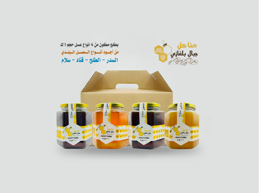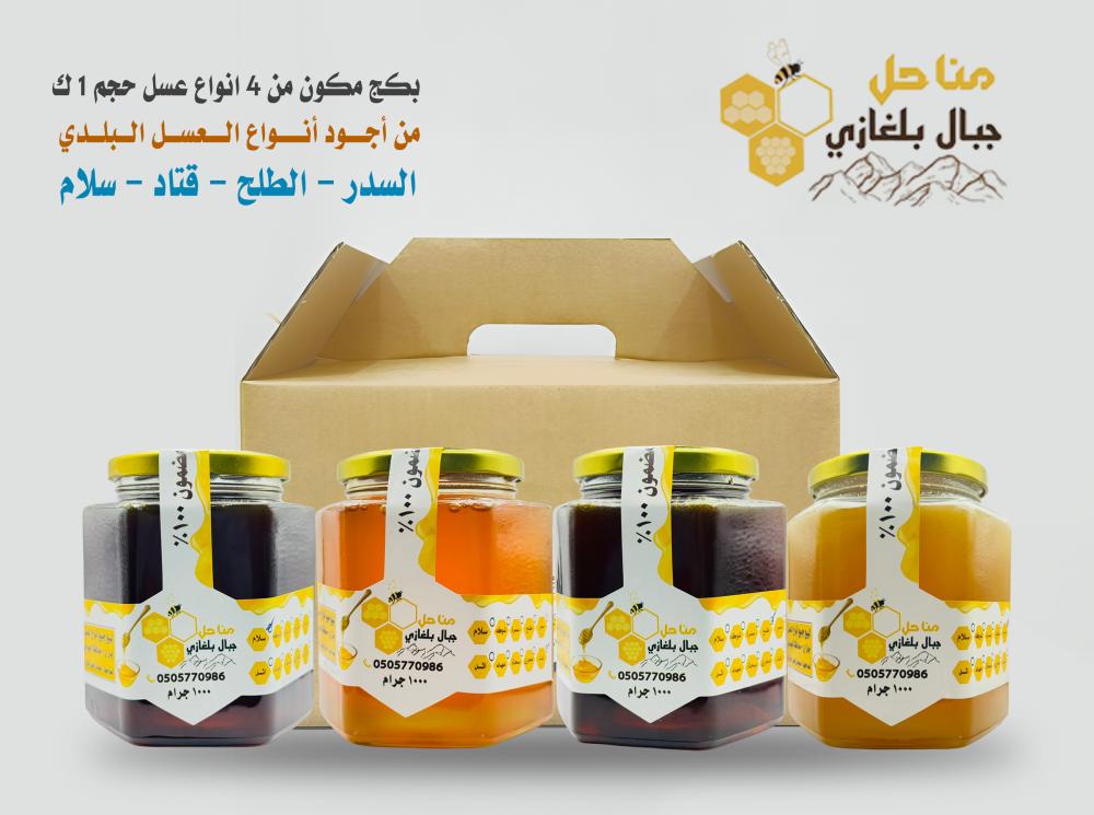 بكج مكون من 4 عبوات عسل سعة 1 كيلو لكل عبوة - انواع العسل ( سدر - طلح - سلام - قتاد ).